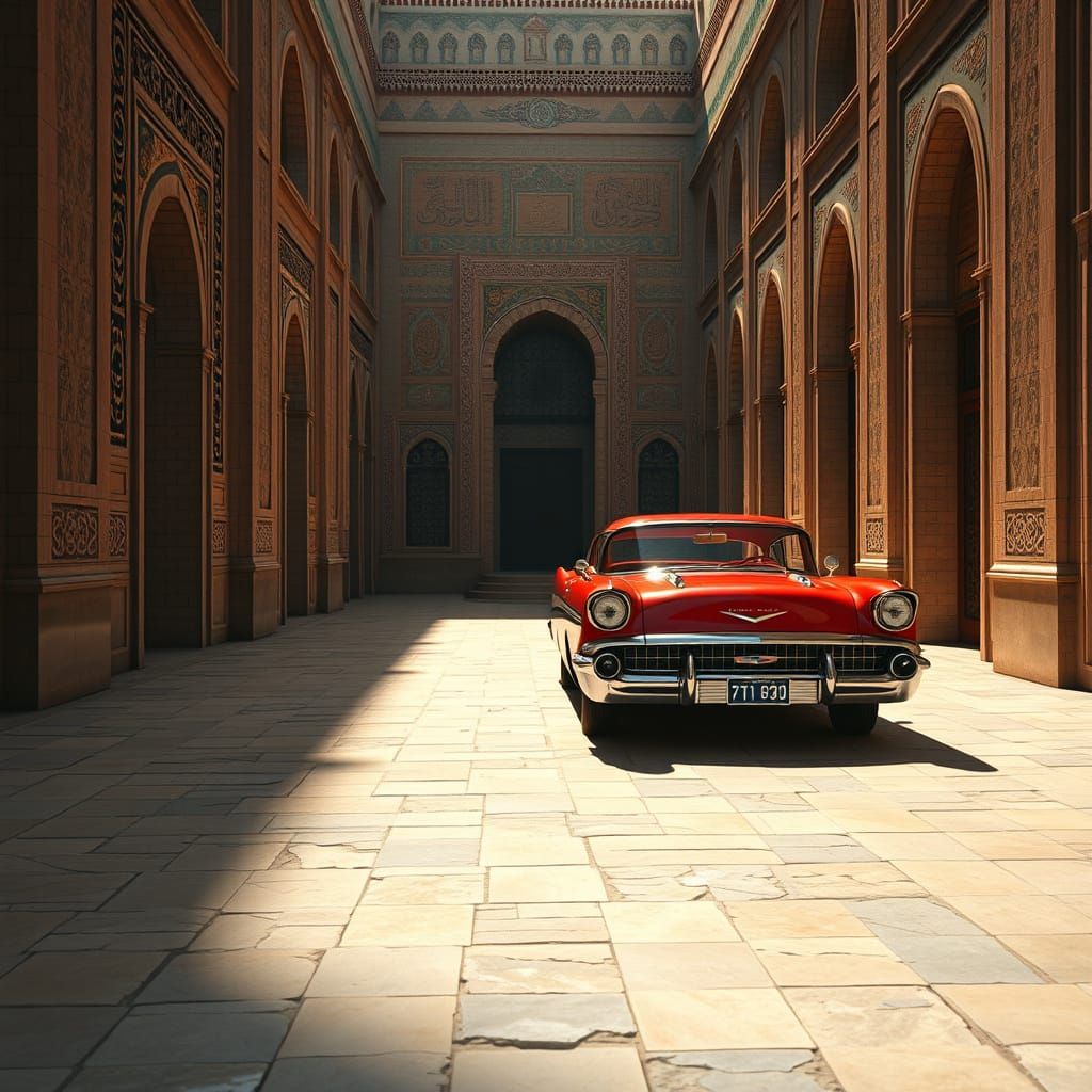 This image shows a classic 1957 Chevy Bel Air driving through a sun-drenched Iranian courtyard. The car's red paint shines, complemented by ancient Islamic mosaics in a photorealistic aesthetic.
