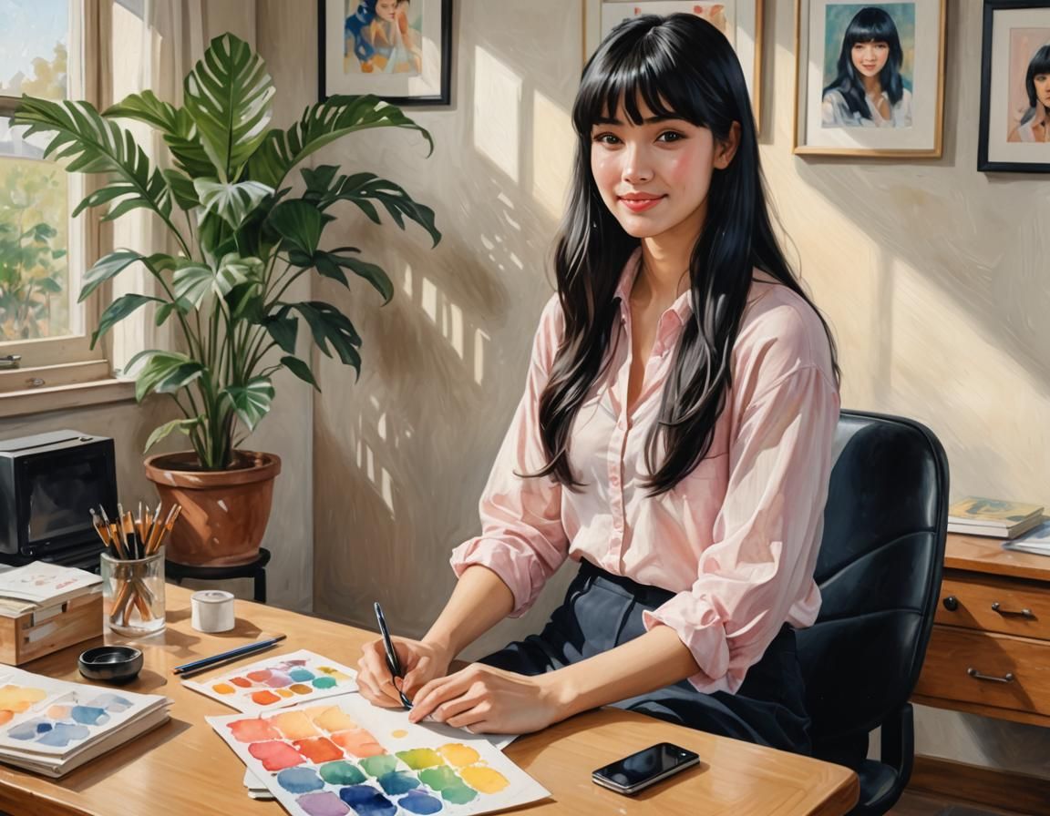 A striking picture of a woman with long black hair sitting at a desk. This digital artwork features soft textures, warm lighting, and a pastel color palette in a watercolor style.