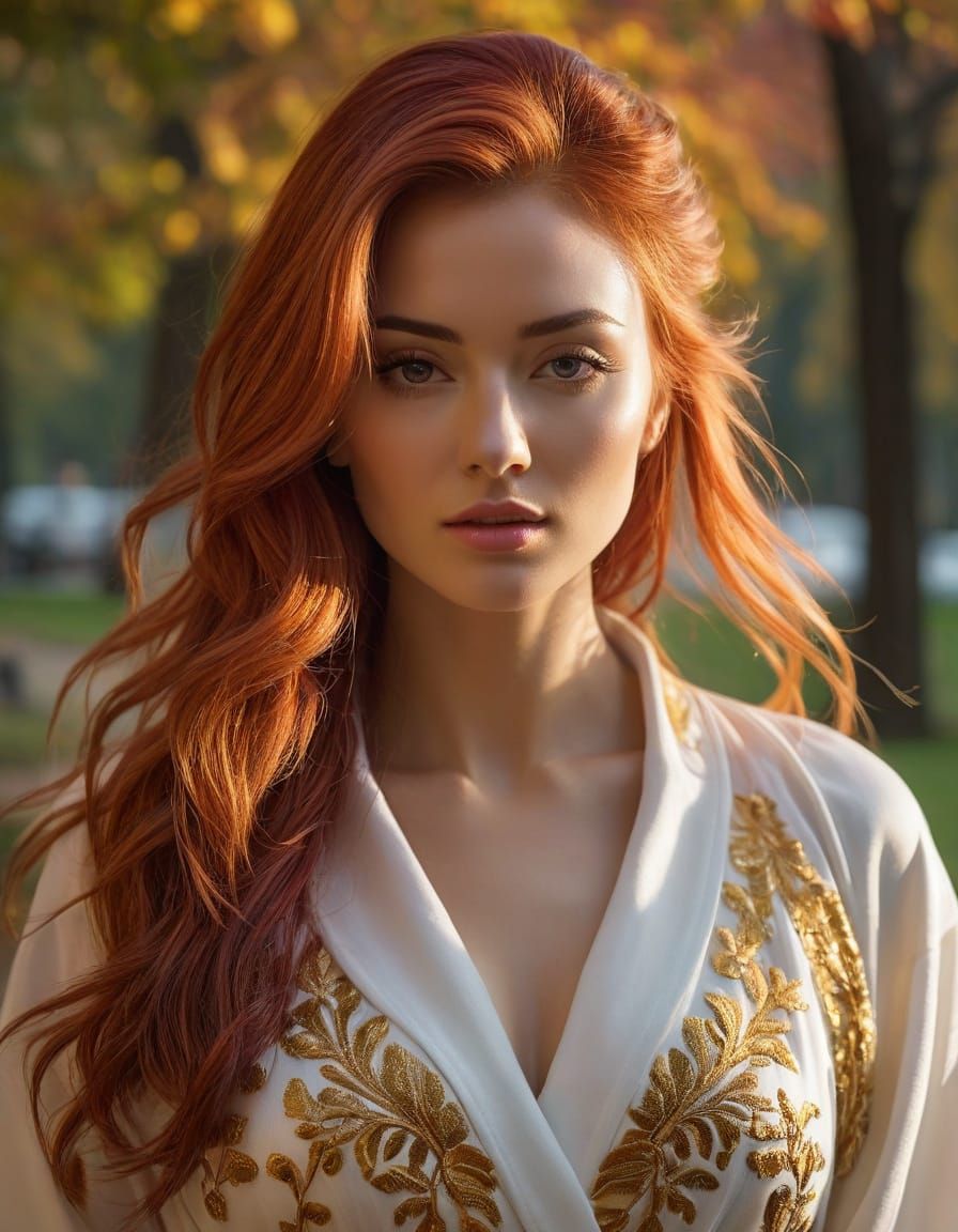 This image shows a beautiful young woman with long red hair walking in a park. The portrait is in a vibrant, realistic oil painting style with golden hour lighting and a softly blurred background.