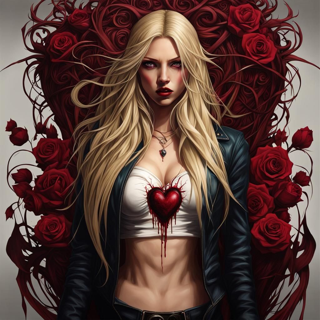 This image shows a tall woman with long blonde hair and a heart being ripped from her chest. The image uses deep colors and realistic details to create a horror aesthetic.