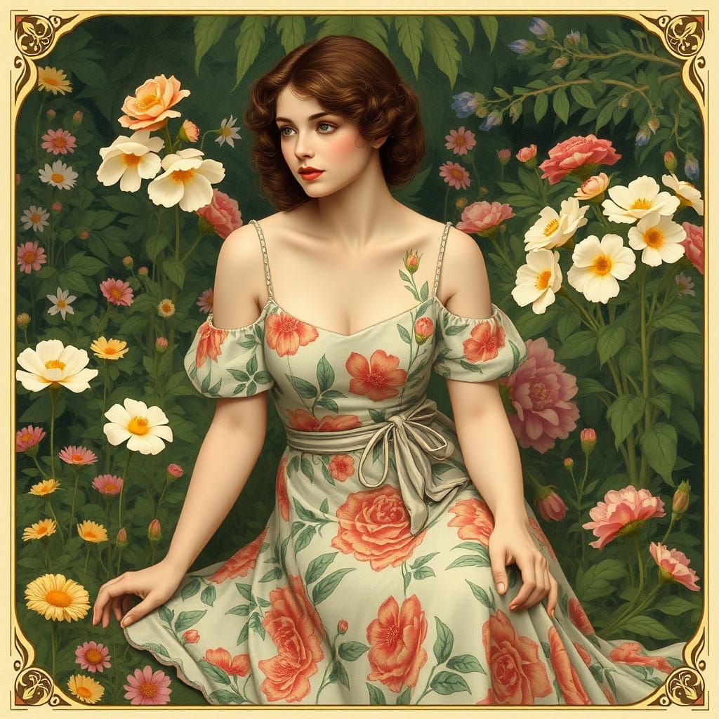 A beautiful woman in a floral dress sits in a vibrant garden. The image, in an Art Nouveau style, showcases intricate details and soft, elegant colors.