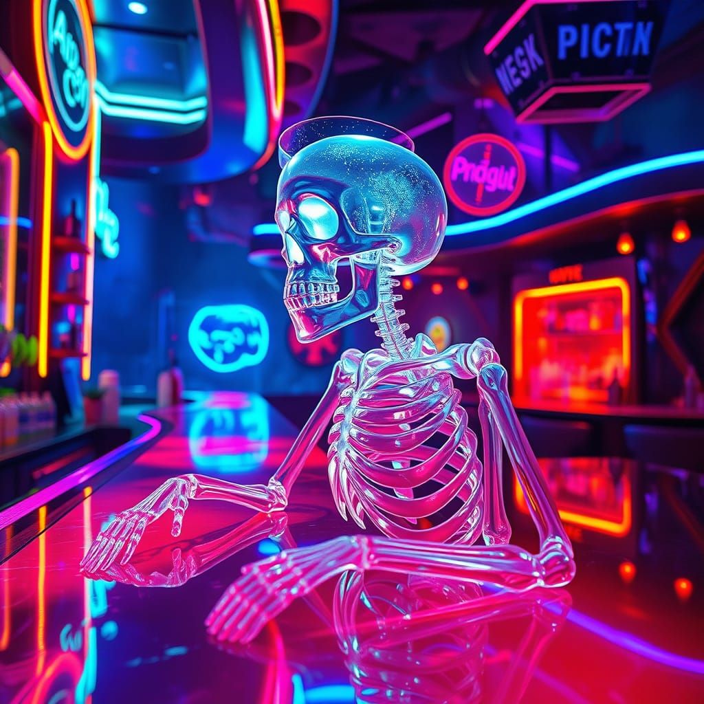 A crystal skeleton sits at a shimmering, neon bar counter. Bioluminescent light reflects across the vibrant, crowded bar in a futuristic aesthetic.