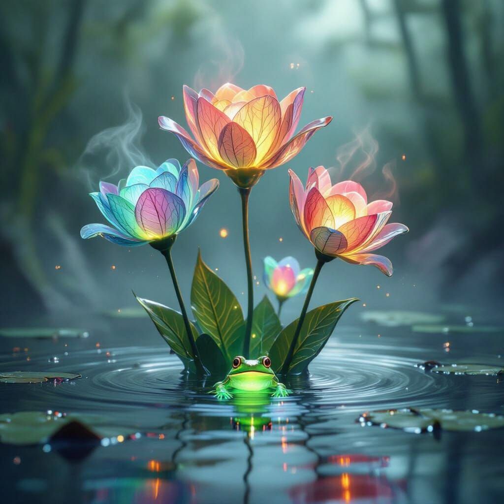 This image shows a mystical swamp scene with glowing, multicolored glass flowers and a bioluminescent frog emerging from bubbling water. The atmosphere is misty and highly detailed with vivid colors.