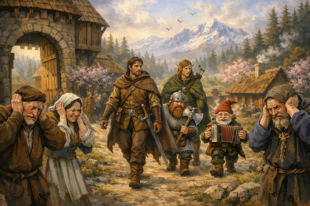 Early spring morning in a fantasy land with forests and mountains. A party adventurers set off from the village gates. A ranger in brown jacket and trousers with a sword hanging from his belt leads. A short dwarf in chainmail carrying a large axe, an elf in green tunic and hose carrying a bow on his ...