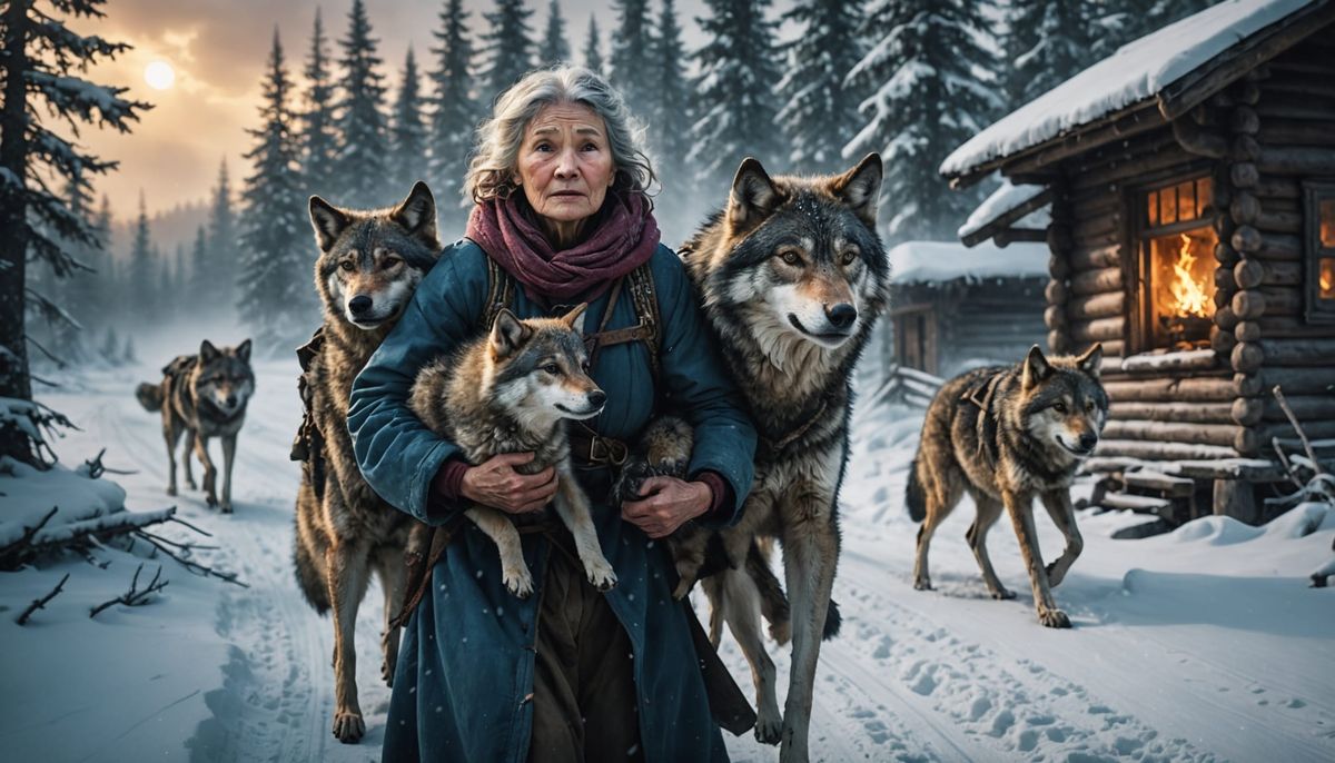 This detailed matte painting depicts an exhausted elderly woman carrying a wounded wolf through a blizzard in the taiga. Three wolf cubs follow her. Fantasy concept art in deep, complementary colors.