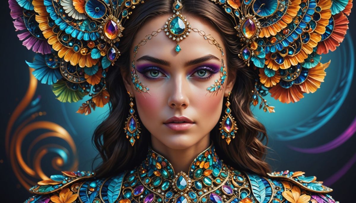 A hyperrealistic portrait of a beautiful woman adorned with futuristic jewelry and colorful clothing. The image features abstract fractal and Zentangle elements, rendered with 3D shading.