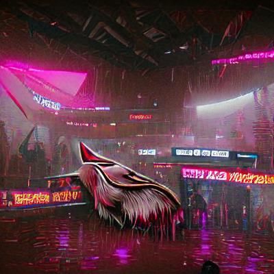 This image shows the Arizona Coyotes logo reimagined in a cyberpunk aesthetic. Neon lights and futuristic elements evoke the gritty, tech-driven worlds of Blade Runner 2049.