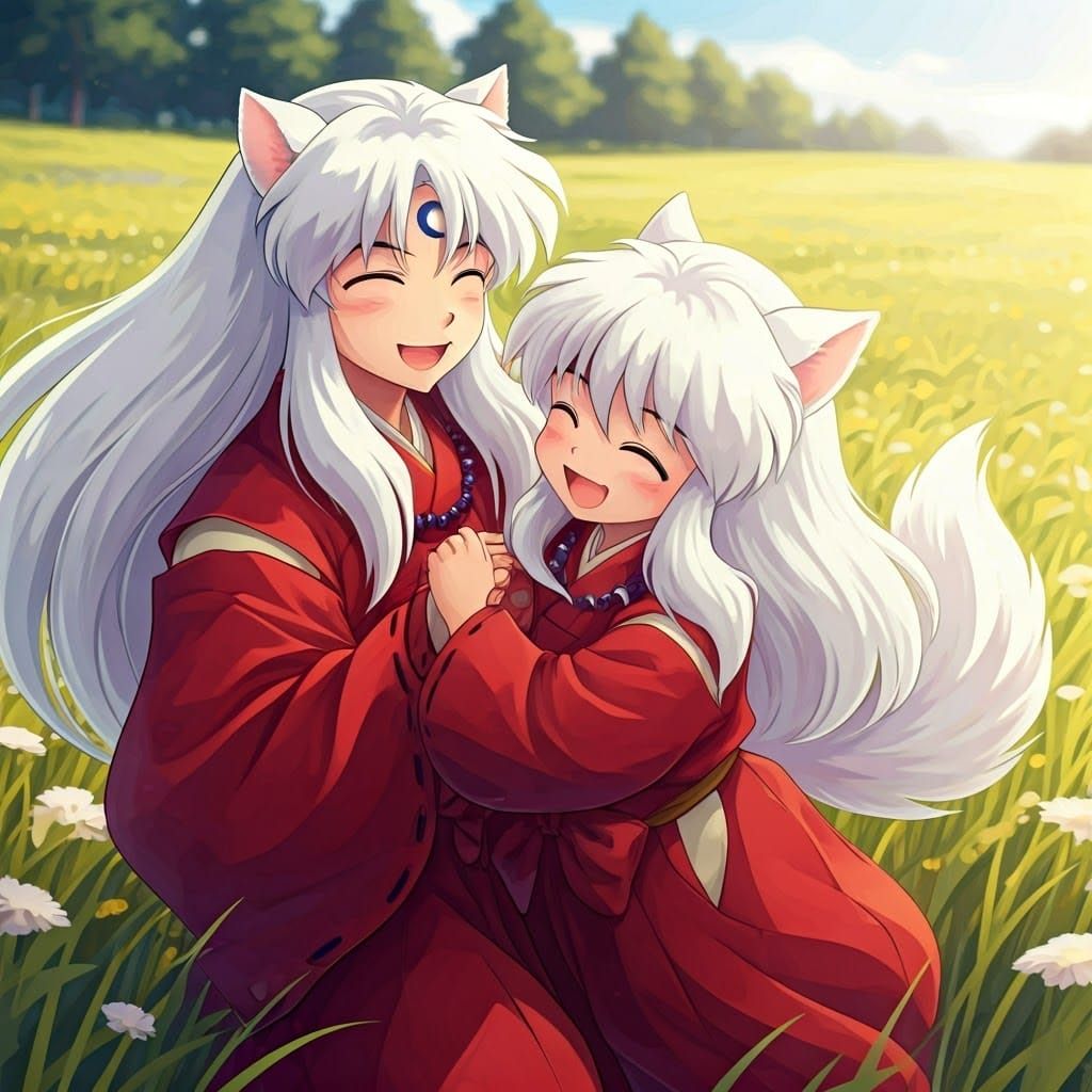 This vibrant image captures two young brothers, Sesshōmaru and Inuyasha, in a joyful moment of play, chasing after a ball in a sun-drenched meadow, with a dynamic, Studio Trigger-inspired style and rich, cinematic colors.