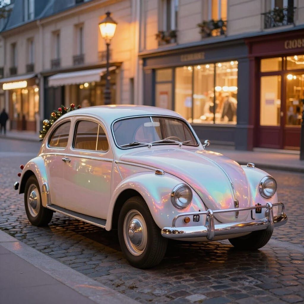 This image shows a vintage car with iridescent paint on a Parisian street at twilight. Cobblestones reflect warm light, with subtle holiday decorations, evoking a romantic, dreamlike atmosphere in impressionist style.
