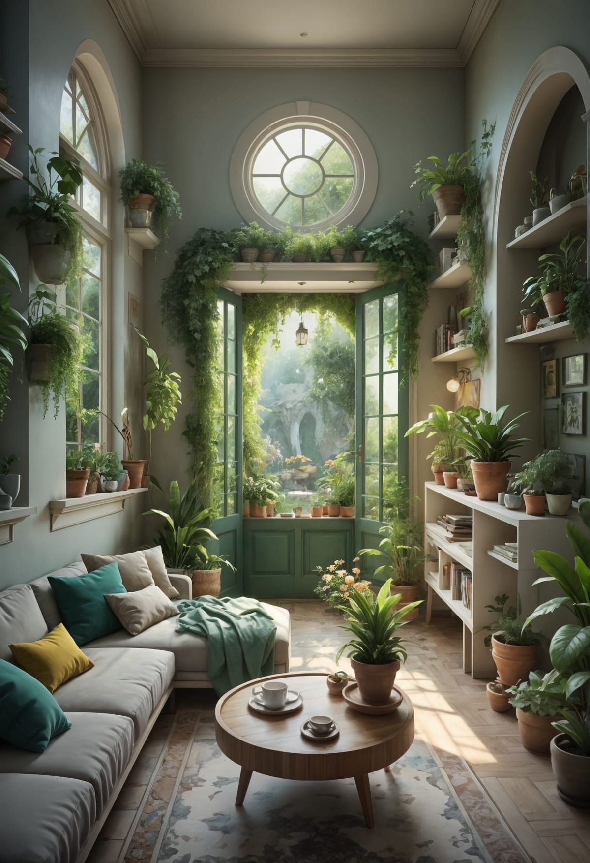 A striking picture of an open door leading to a beautiful secret garden. This 3D render showcases enhanced beauty and deep colors, with a hyperrealistic, cinematic feel and isometric perspective.