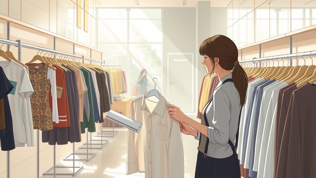 A brightly lit, contemporary clothing store scene featuring a young woman holding a shirt and talking to a store assistant. This digital artwork is rendered with delicate lines and soft colors.