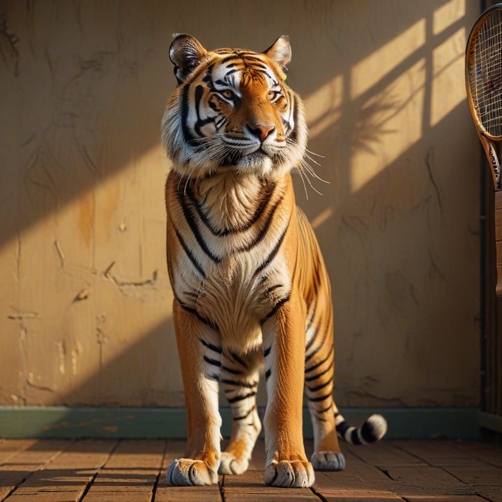 This image shows a Bengal tiger standing upright, holding a tennis racket, and wearing a sweatband, rendered as hyper-realistic digital art. The close-up shot features highly detailed textures in warm dusk lighting.