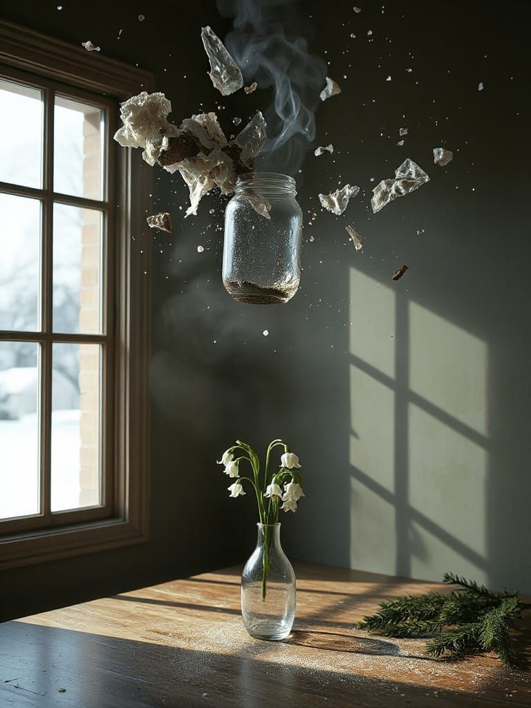 This image depicts a symbolic interior scene of emotional release. A shattering glass jar releases dark elements that dissolve into light, replaced by a vase of lilies symbolizing hope. The scene blends decay with freshness, created in a painterly realism style.