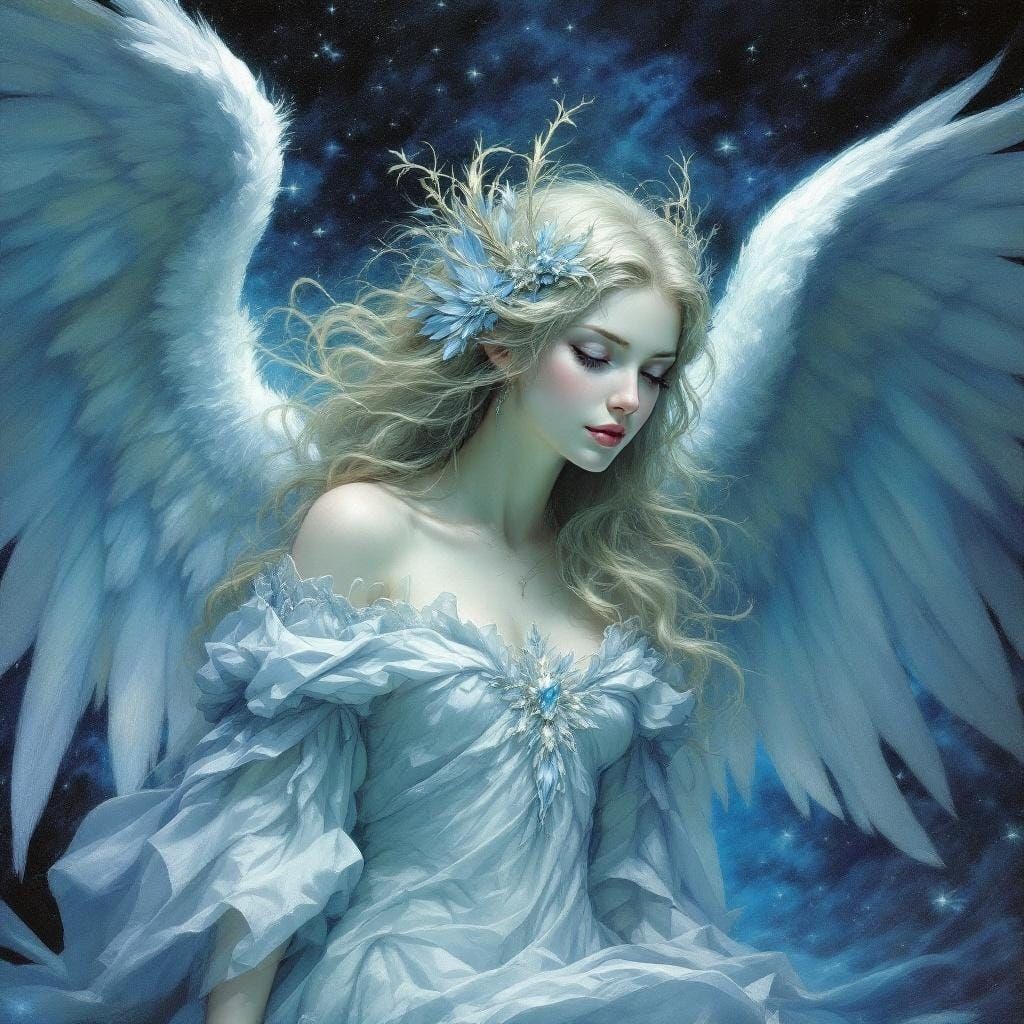 This image shows a detailed portrait of Raguel, a fantasy archangel of harmony. The color palette is dominated by pale blue hues.
