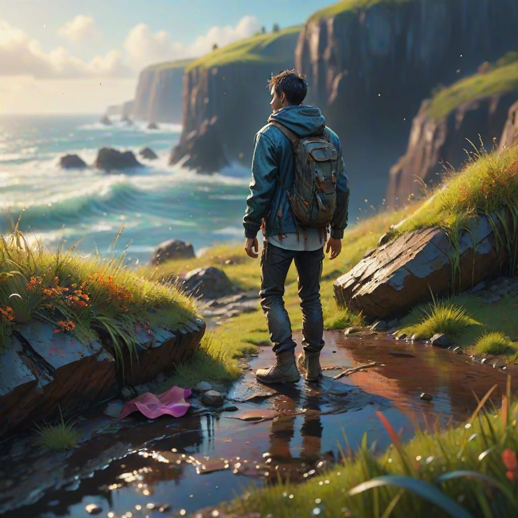 This hyperrealistic concept art features a figure at a cliff's edge under dramatic, cool afternoon lighting. The image boasts vibrant, saturated colors and intricate detail, reminiscent of cinematic splash art.