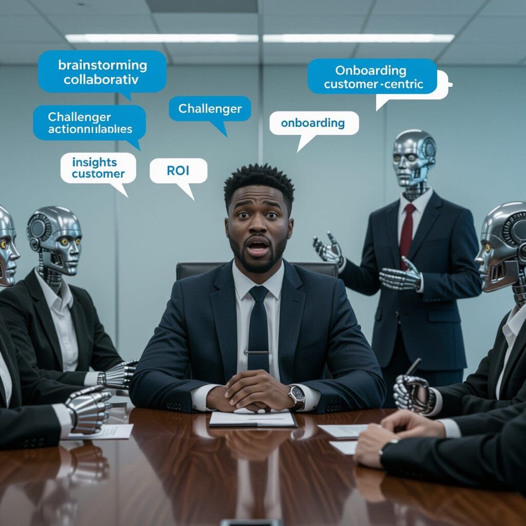 A stark illustration captures a man's realization of wasted time amidst robotic colleagues and corporate jargon in a sterile conference room.