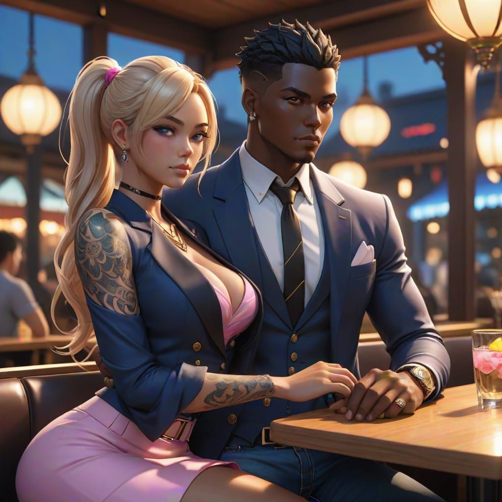 A detailed 3D anime-inspired artwork of a muscular Haitian-American man with dark chocolate skin, leaning into a woman in a restaurant booth, set against a nighttime glow with realistic lighting and shallow depth of field.