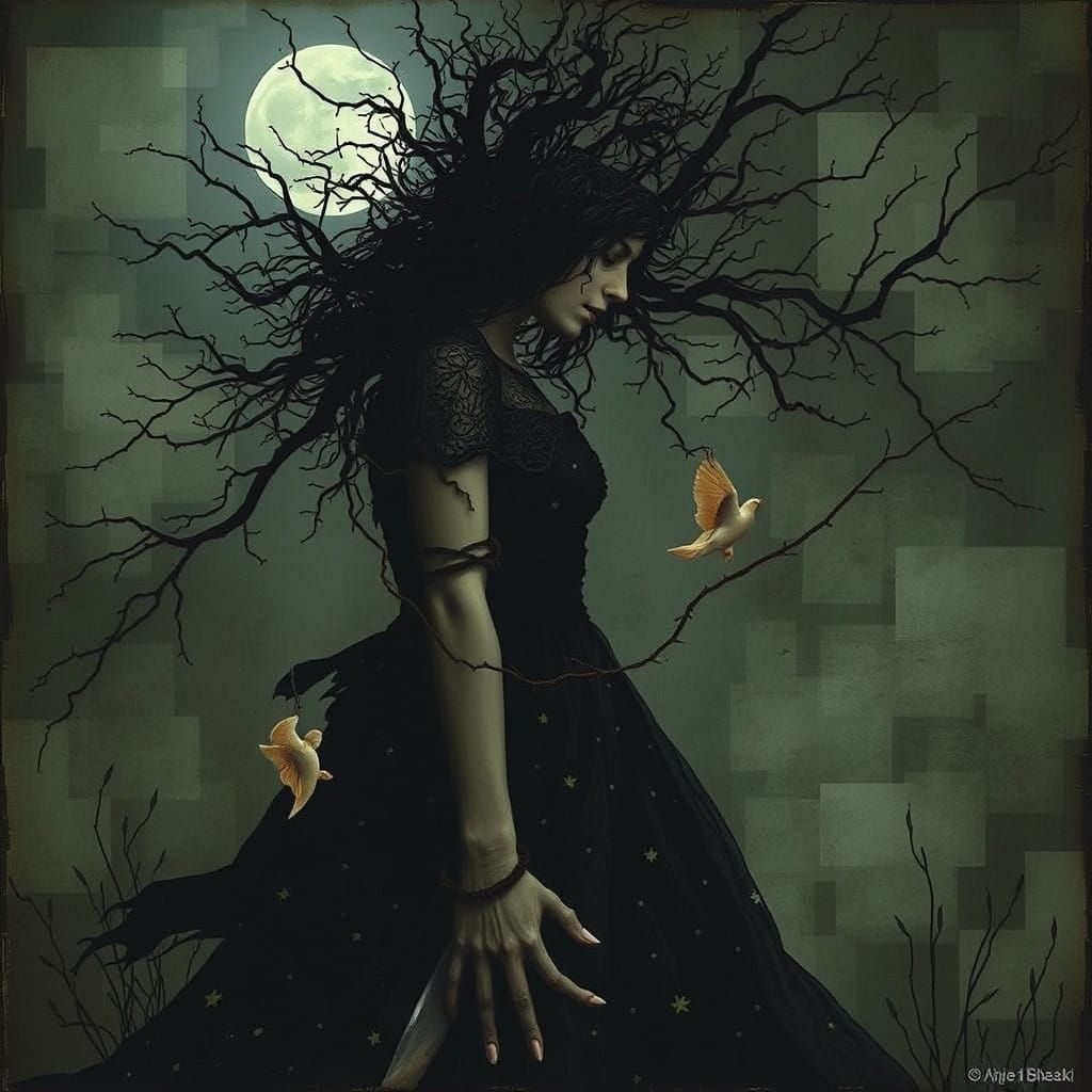 This image depicts a mysterious woman arriving at a house under the cover of darkness, driven by her determination to solve a puzzle. She is accompanied by her unyielding pride and a knife, as seen in a work that blends meticulous detail with intricate, entangled elements.