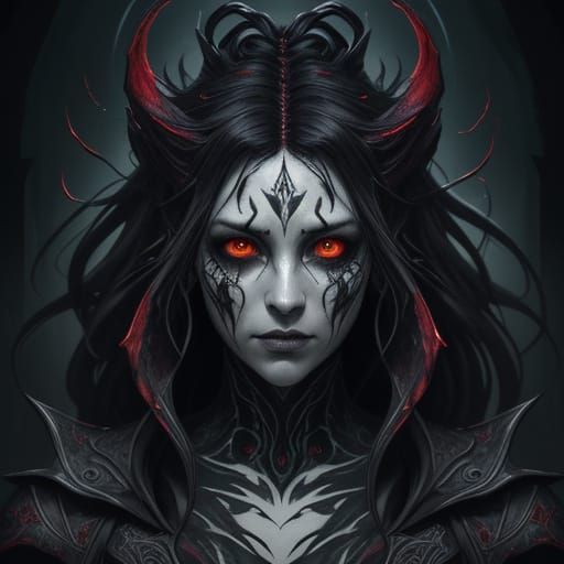 This haunting portrait of an eldritch creature is set against a dark, fragmented night sky with bold, expressive brushstrokes and triadic colors. Ink wash painting style with red and green accents glowing with an otherworldly light.