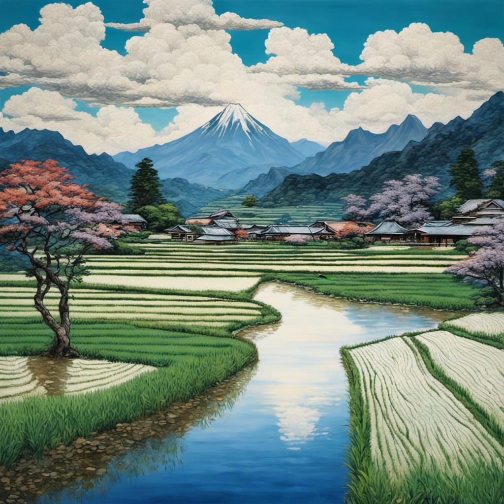 A vibrant painting of rice fields and mountains. The artwork captures a serene landscape using a blend of impressionistic and ukiyo-e artistic styles with rich blues and whites.