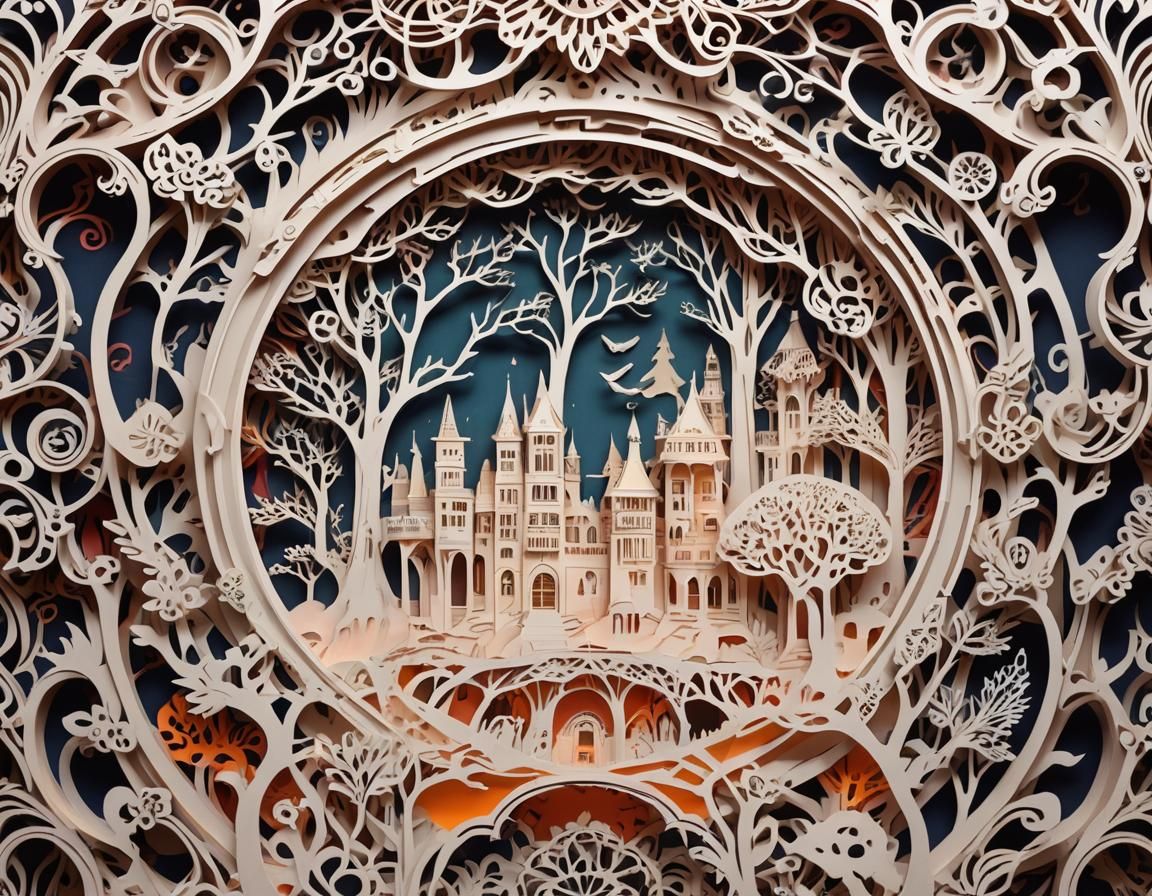 A multilayered, colorful paper-cut image in the Kirigami style. The artwork has a realistic, storybook illustration feel with insane intricacy, high contrast, and moody, cinematic atmosphere.
