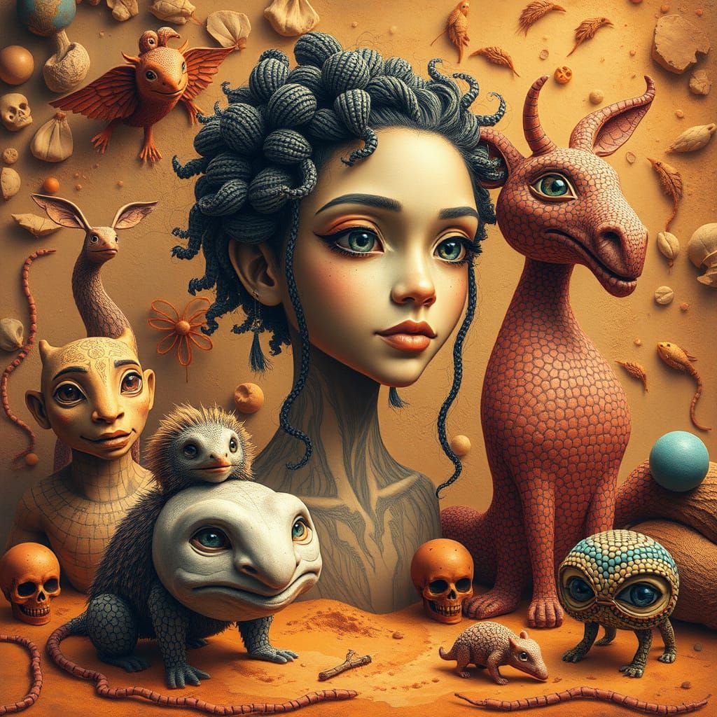 A surreal environment filled with vibrant pencil portraits, clay sculptures, and aboriginal dot art. Hyperdetailed textures and soft warm lighting add to the dreamy quality in gouache style.