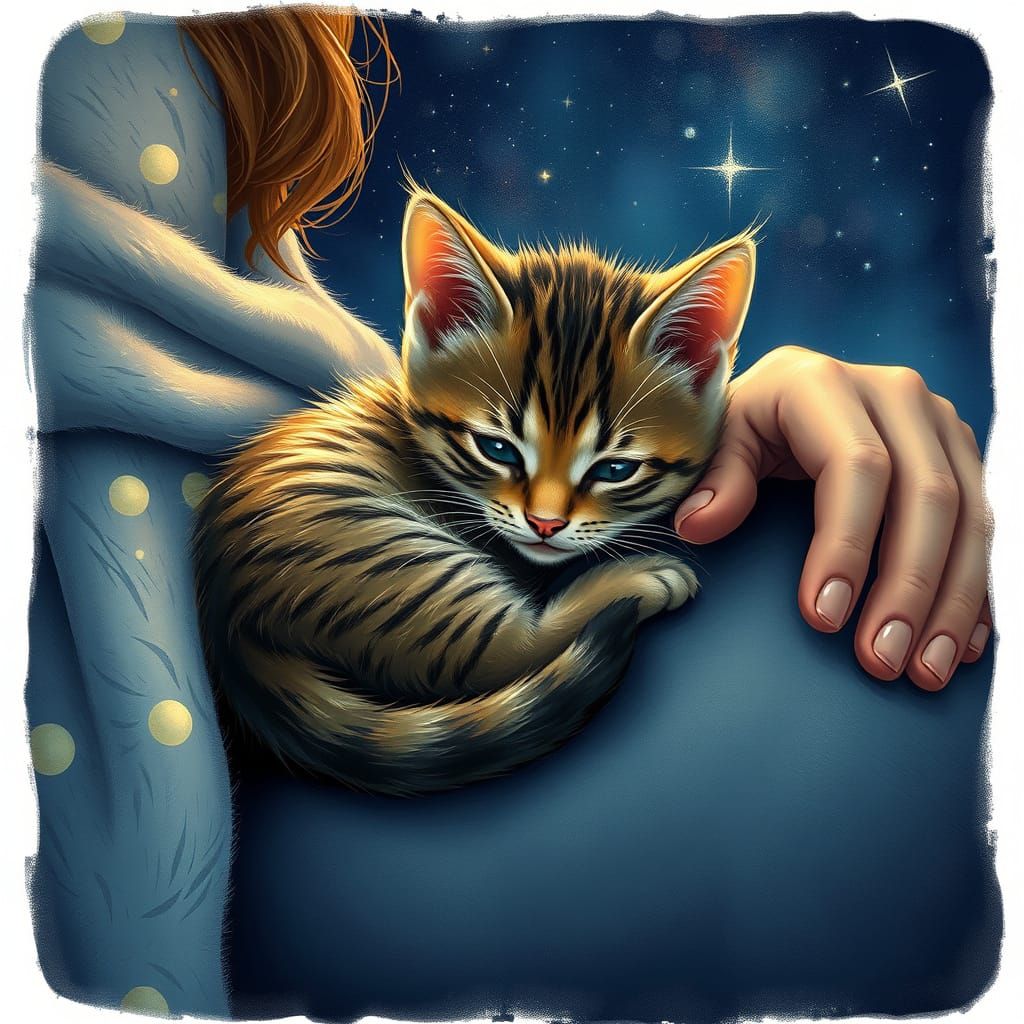 This enchanting image shows a serene woman holding a cuddly kitten, surrounded by a starry night sky. The illustration is a charming blend of whimsy and realism, reminiscent of a classic storybook tale.