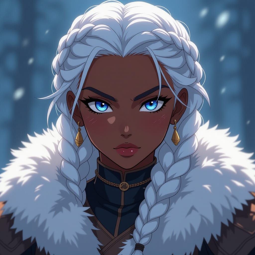 This anime-style image features a determined female fighter with black skin, white braided hair, and blue eyes, wearing heavy fur-trimmed clothes. Rendered with deep colors and cinematic lighting.