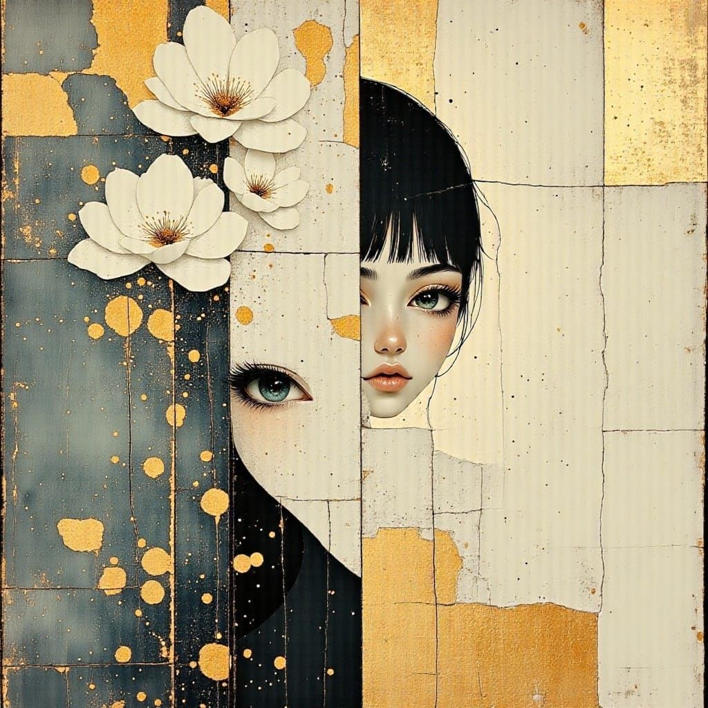 A semi-abstract floral arrangement featuring wildflowers in muted tones. The image evokes a dreamlike, emotional atmosphere through soft focus, cracked paint textures, and subtle gold leaf accents in an impasto style.