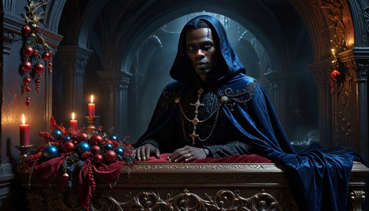 This oil painting depicts a vampire emerging from a coffin in a crypt, adorned with dark Christmas decorations. Features dramatic lighting and a crimson, blue, and ember color palette.