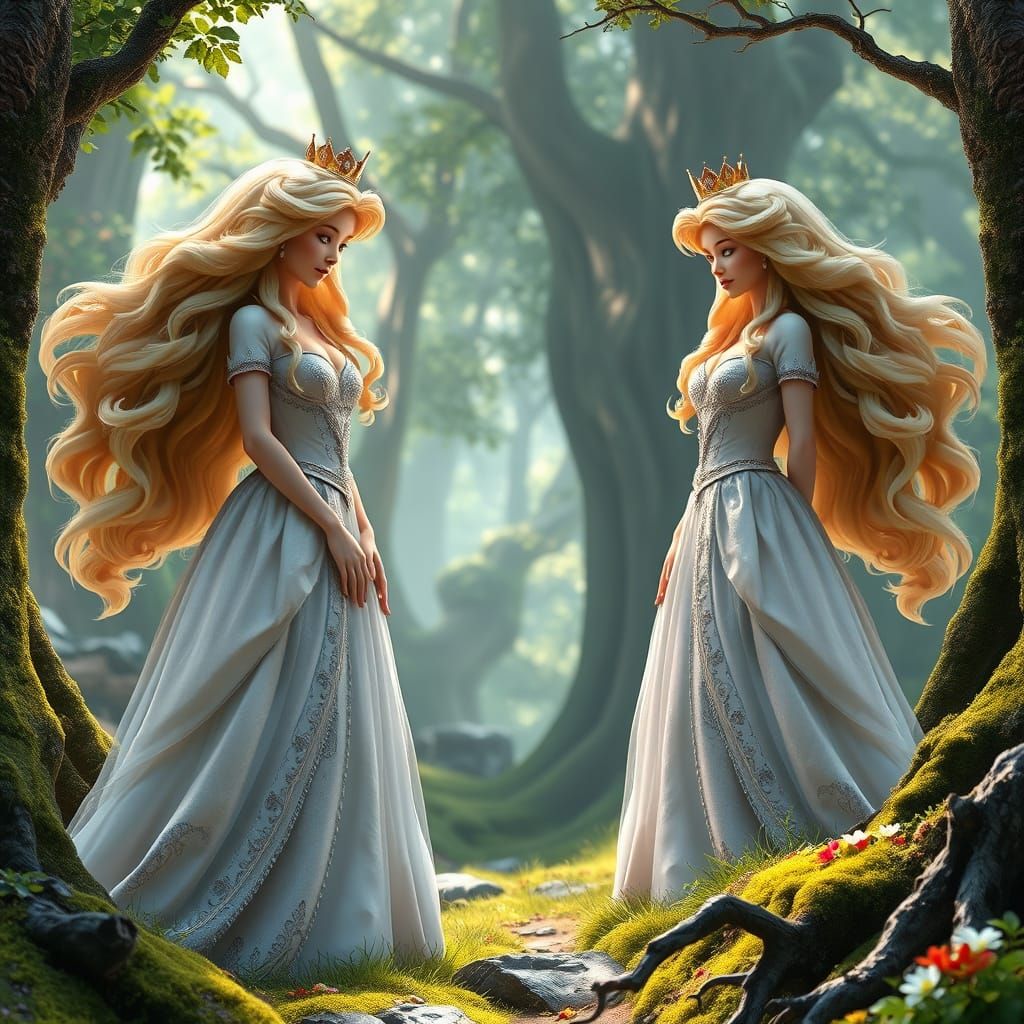 This image shows a regal princess in an elegant gown standing in a mystical forest glade. An identical princess peers down at her from the other side. The image has a hyper-realistic 3D rendered aesthetic.