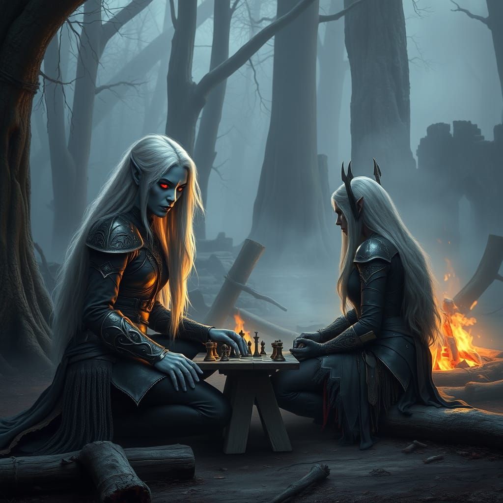 A photorealistic high fantasy image of a fierce female drow warrior sitting by a campfire, playing chess with a female wood elf warrior, surrounded by a foggy forest and ancient ruins, in a style that blends atmospheric detail and vibrant color.