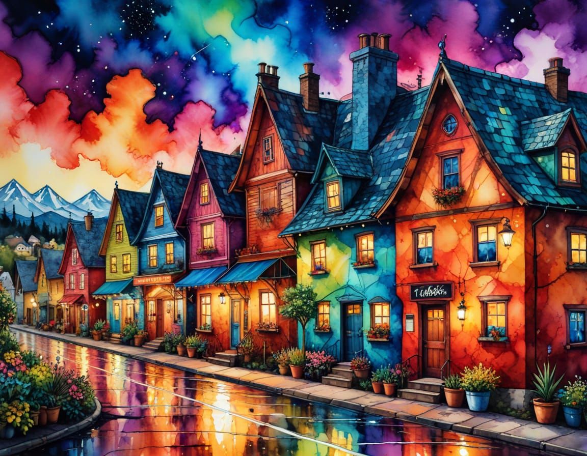 This image showcases a vibrant village street in a fantasy watercolor style. It features a corner coffee shop, colorful buildings with mural art, and lush potted plants under psychedelic skies.