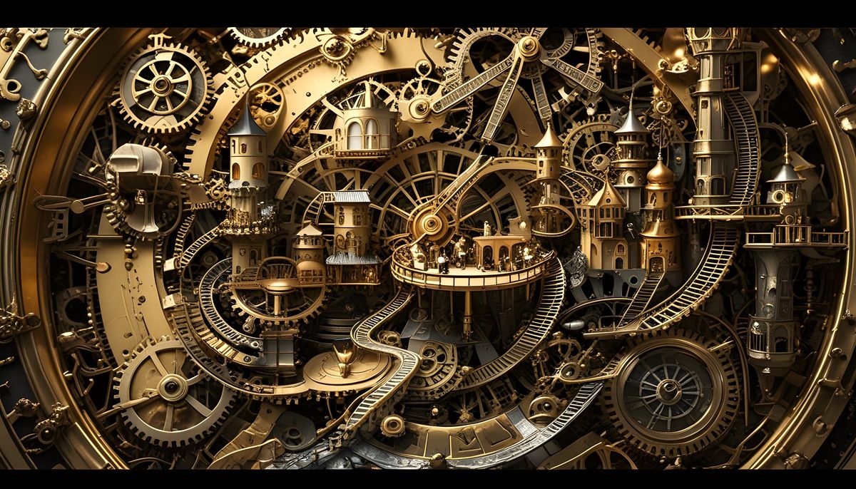 This image features a detailed miniature city built within an antique grandfather clock. Gears transform into windmills, and clock hands become pathways, showcasing intricate brass and copper elements illuminated by golden light.