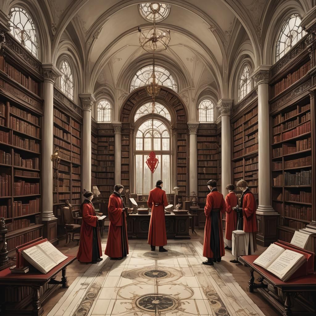A detailed matte painting of a sleek game card featuring noble figures in red robes and white suits. The scene is set in a Gothic Jugendstil mansion with a dark, antique atmosphere.
