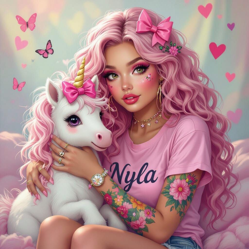 This image shows a woman with pink hair holding a unicorn toy. The artwork features vibrant colors, delicate lines, and intricate details to create a dreamy, fantastical atmosphere.