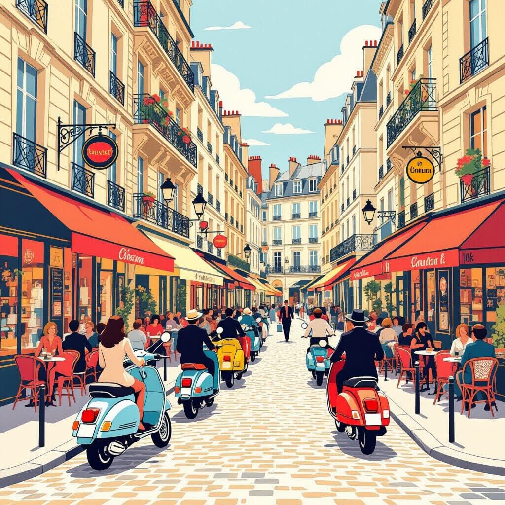 This image depicts a lively 1960s Parisian street with vintage Vespas and stylish pedestrians. The artwork features flat illustration and a retro color scheme, inspired by mid-century graphic design.
