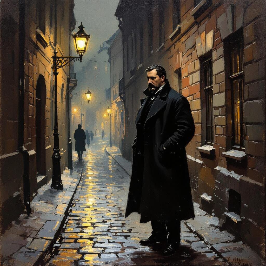 This image shows a contemplative detective in a dimly lit 1900 St. Petersburg alleyway. Rendered in a moody, dark realism oil painting style with a muted color palette.