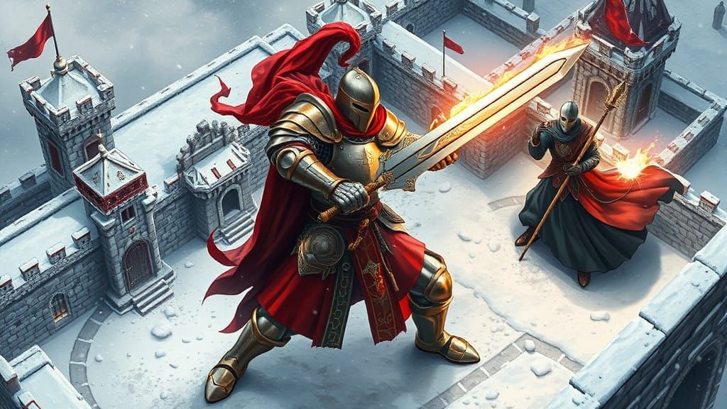 A vibrant isometric scene of a knight battling a mage within a snow-covered fortress. Magical lightning and dynamic action enhance this dramatic image, realized as digital art.