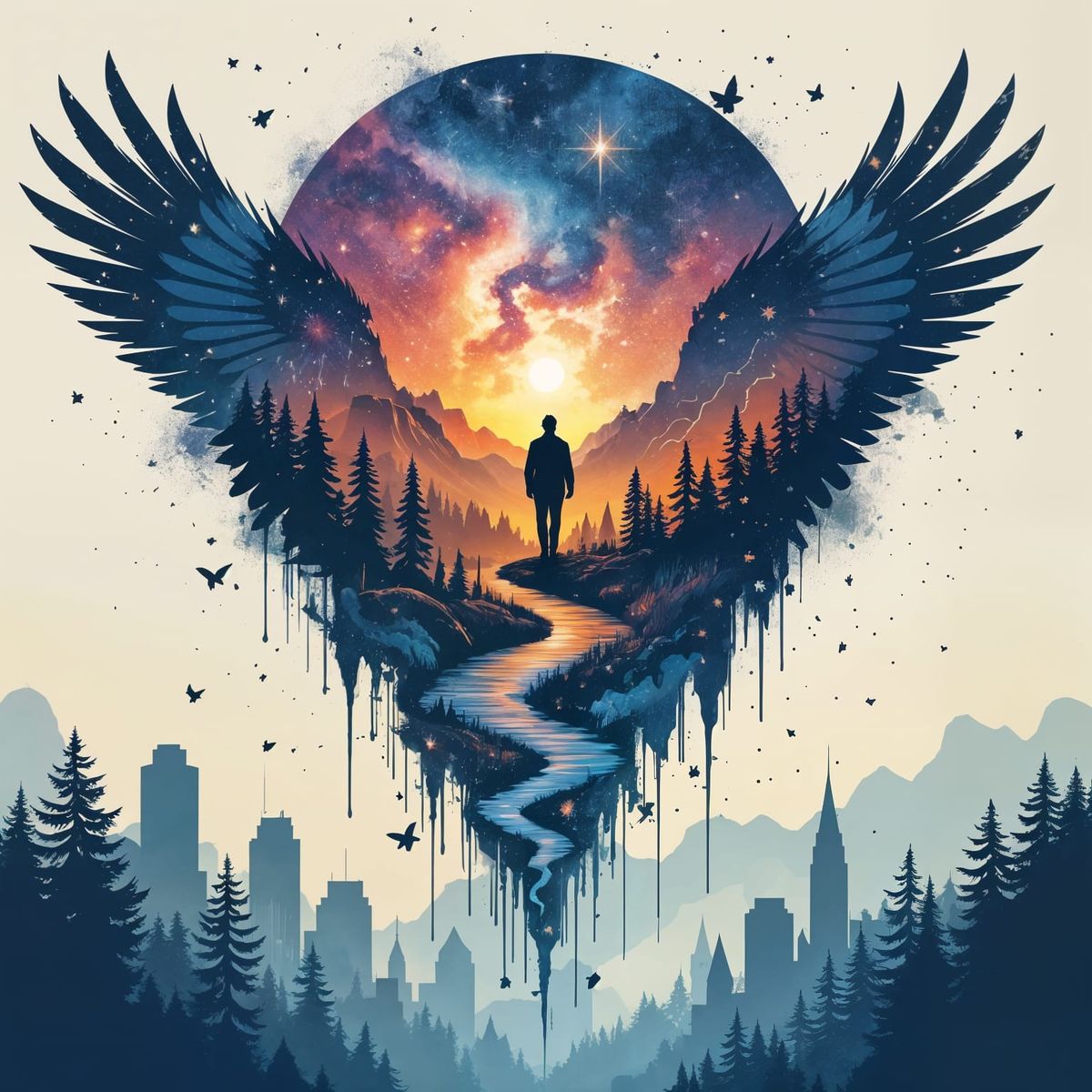 A surreal double exposure image blending a vibrant galaxy with earthly elements. The artwork features trees, stars, a cityscape, animals, and silhouetted eagle wings in a maximalist style.