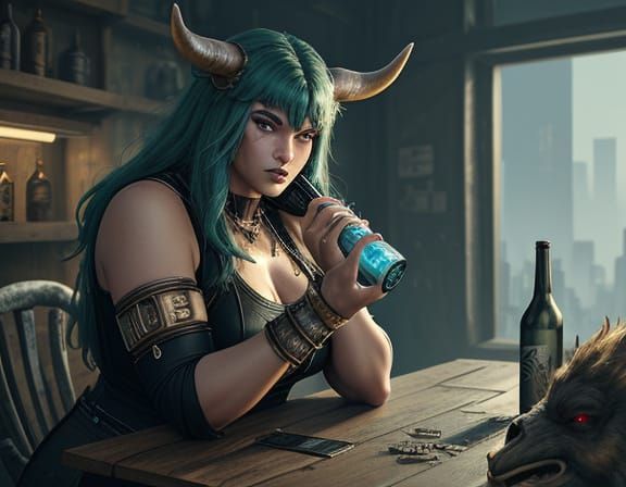 This image shows a plus-sized female Minotaur Barbarian in conservative clothing, holding a bottle near a Tablelands, rendered in a cyberpunk aesthetic with manga and Kemonomimi elements.
