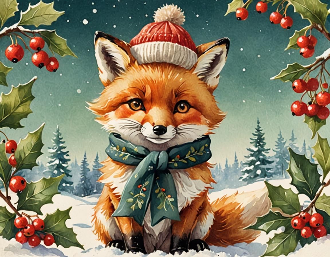 A charming image of a fox wearing winter clothes, standing in the snow with holly. This picture evokes a vintage postcard with its warm lighting, soft shadows and watercolor aesthetic.