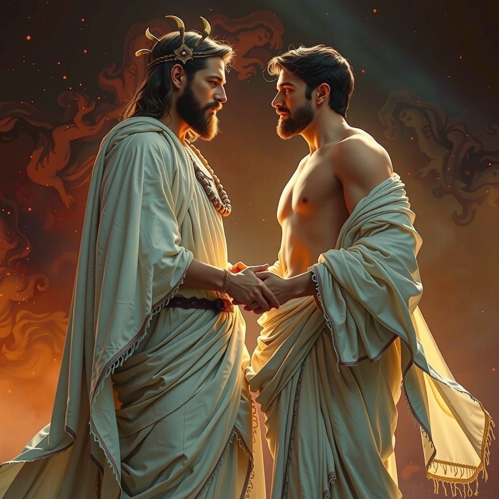 A classical sculpture depicts Apollo and Hyacinthus in flowing robes, embracing in awe. The marble statue is set against a warm cinematic backdrop with film grain and atmospheric lighting.