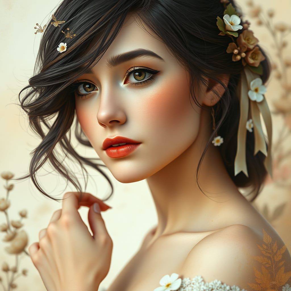 This captivating portrait showcases a young woman with delicate features, lost in thought, surrounded by a dreamy blend of soft watercolor textures, muted earthy tones, and vintage botanical elements, evoking a sense of serenity and romance.