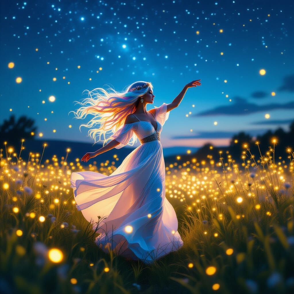 This image shows a woman dancing in a field of glowing plants under the stars. The surreal fantasy scene is rendered with vibrant colors and intricate details, in a professional photography style.