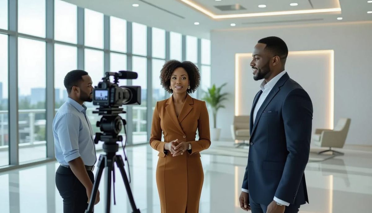 “Inside a modern African megachurch office with glass walls and polished floors, investigative journalist Mrs. Ozioma Nwude (41, chocolate-brown skin, short curly afro) stands with a small camera crew, pretending to film a documentary on the church’s success. Pastor Malachi (48, dark brown skin, elegant suit) greets them politely, smiling, but his eyes show subtle fear. Ozioma’s gaze scans the office carefully, suspicious of everything around her. Dramatic lighting highlights shadows in the corners, creating a tense, suspenseful atmosphere. Realistic African characters, modern office interior, cinematic investigative mood.”