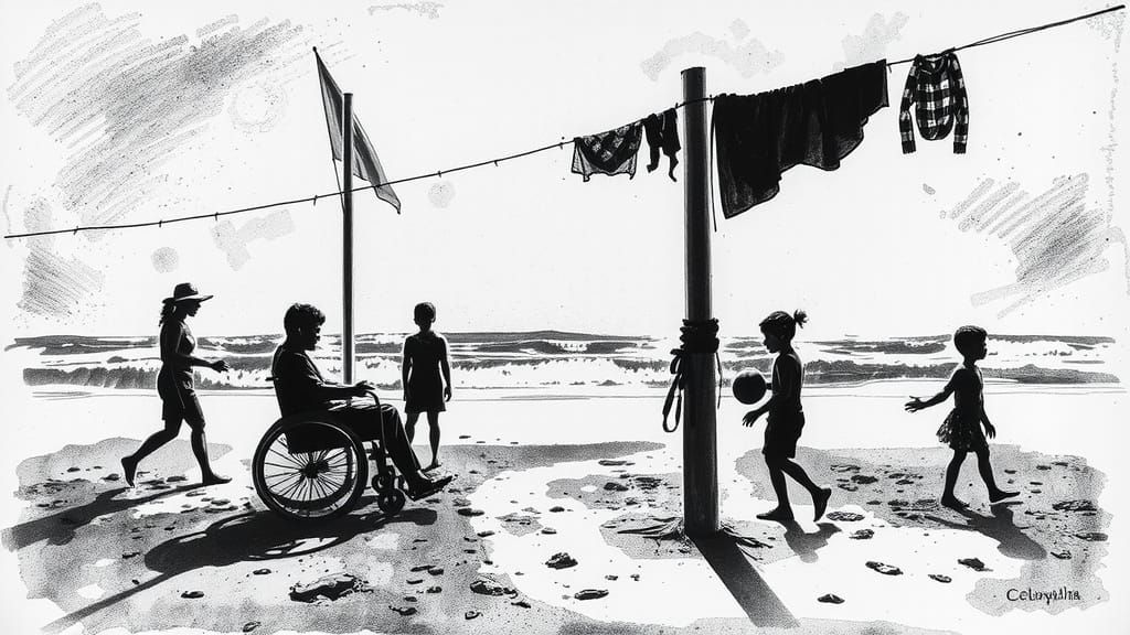 A monochrome, pointillist expressive charcoal sketch of [A poignant beach scene with silhouetted figures, including a person in a wheelchair, children playing with a ball, and laundry hanging, highlighting themes of inclusivity and everyday life