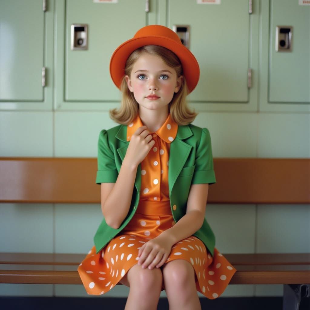 This image shows a shy French girl with pale skin and blue eyes sitting on a bench by school lockers. She wears a polka dot dress, green bolero, and orange hat in a photorealistic style.