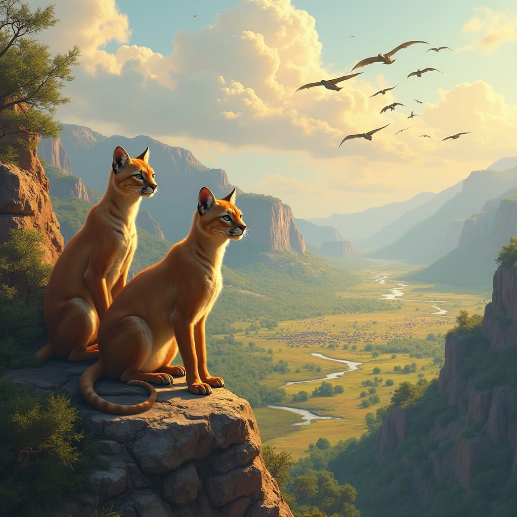 A hyperrealistic image of saber-toothed cats resting on a ledge, overlooking a prehistoric valley filled with wildlife. The artwork features vibrant colors and intricate details in a digital painting style.