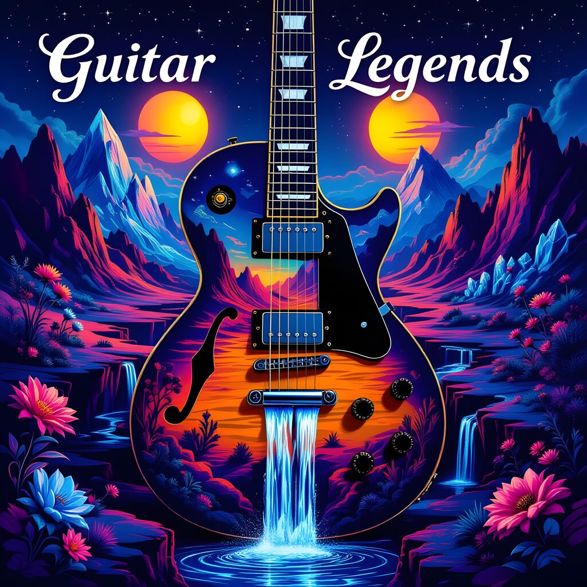 This image shows an electric guitar painted with an alien landscape of crystalline mountains and twin suns. A waterfall flows from the soundhole in a surreal style with neon colors.